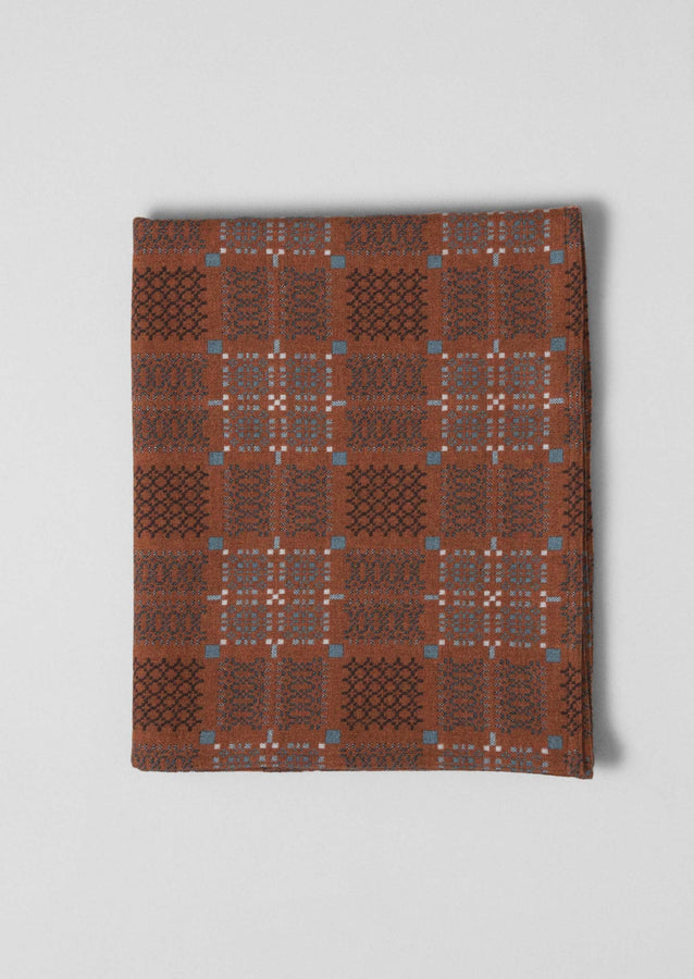 Warm, weighty lambswool Welsh blanket woven in a small white-washed mill in a remote wooded valley on the Pembrokeshire coast by Melin Tregwynt. A mill has stood on the site since the 17th century, and has now been owned by the same family company since 1912. The intricate, reversible Knot Garden weave from the Melin Tregwynt archives was created in the 1950s, and is reimagined in an exclusive colourway for TOAST. Finished with a simple hem, making it fully reversible.