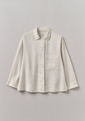 Linen. Garment-dyed. Easy shape. Dropped sleeves. Back hanging loop. Back box pleat. Chest patch pocket. Low-hip length. Side hem slits. Corozo buttons.