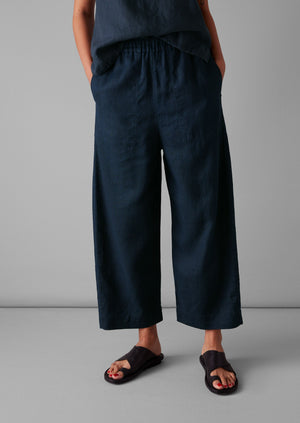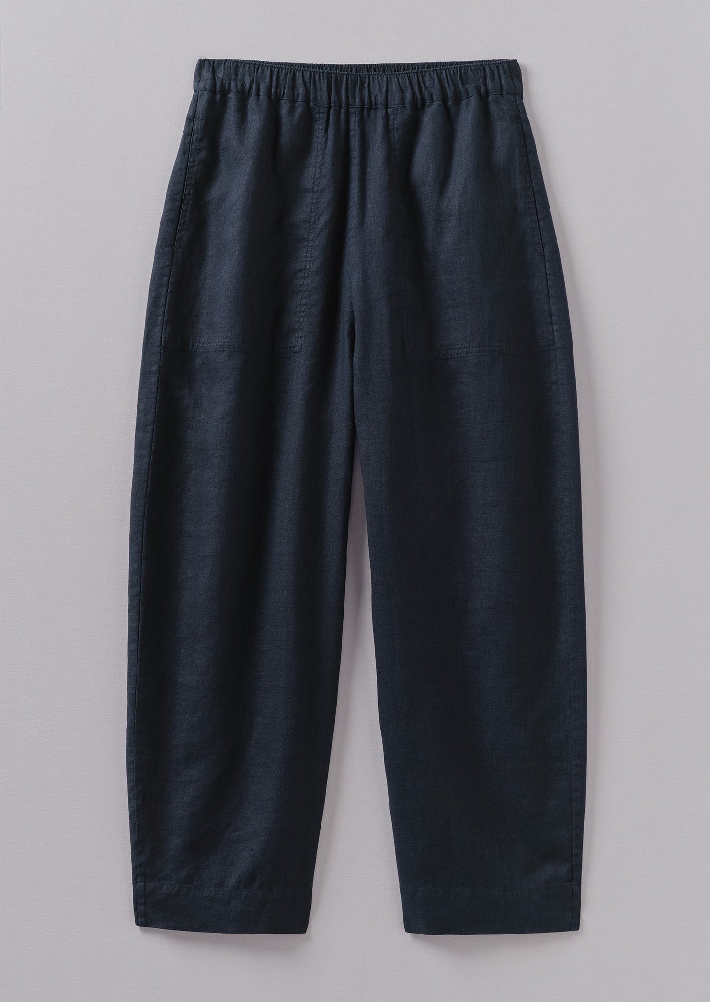 Slubbed linen. Garment-dyed. Easy shape. Elasticated waist. Side pockets. Back patch pocket. Cropped barrel legs.