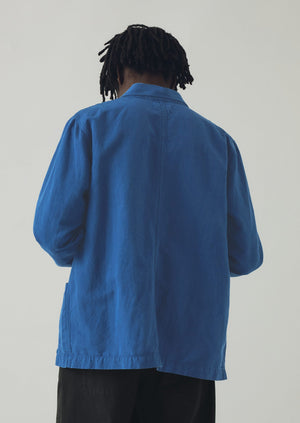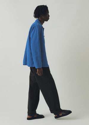 Mid-weight herringbone. Organic cotton and linen blend. Cutaway collar. Patch pockets. Inner hanging loop. Corozo buttons.