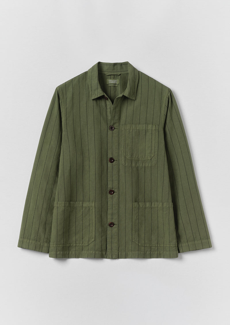 Our pared-back Arlo jacket is made from a striped organic cotton and linen blend which is garment-dyed for depth of colour. Inspired by workwear styles, with large patch pockets. Can also be layered as a shirt. Part of our Menswear collection.