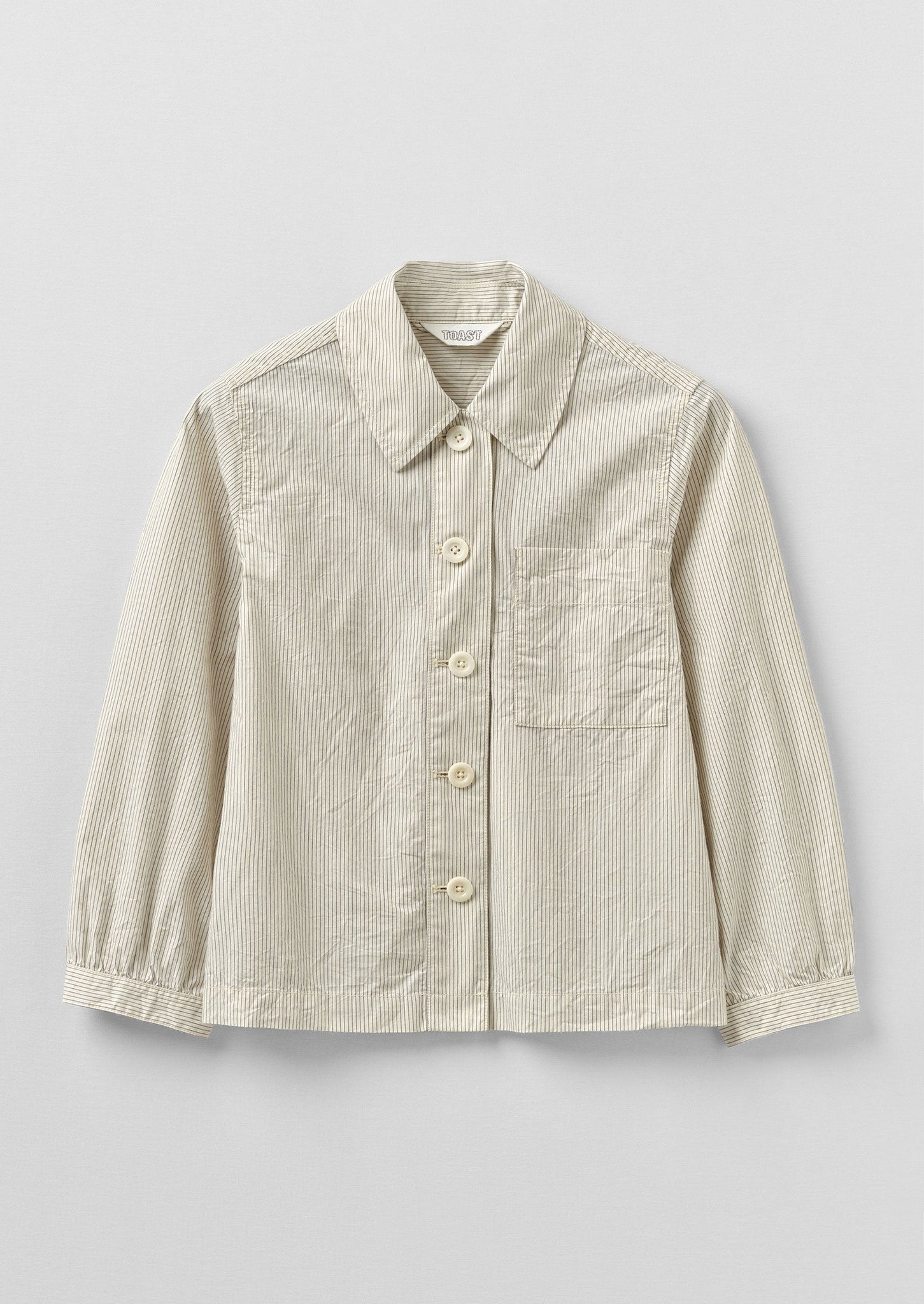 Striped organic cotton poplin. Exaggerated collar. Chest patch pocket. Back yoke panel. Back box pleat. Side hem slits. Corozo buttons.
