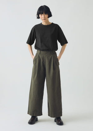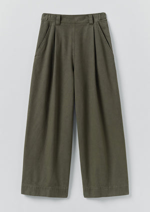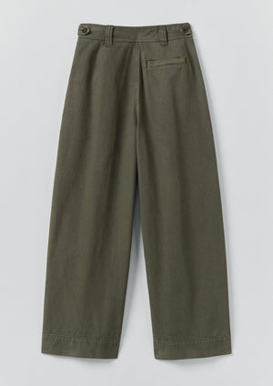 Our pleat front trousers are made from a soft organic cotton canvas. The trousers are garment-dyed, a process that gives each piece a natural colour variation. Shaped with knife pleats at the waist and buttoned waist tabs, inspired by workwear styles.