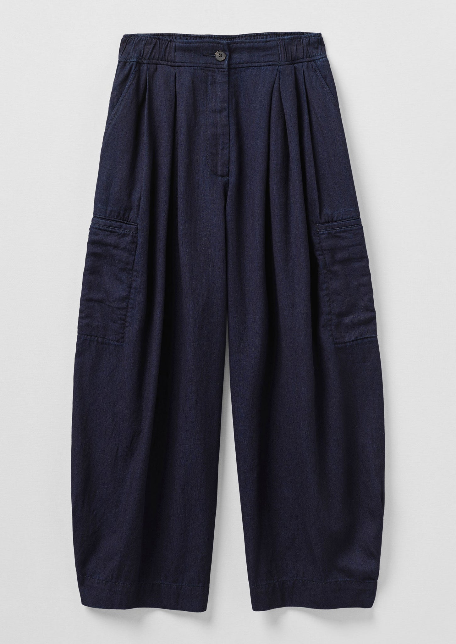 Cotton twill. Easy shape. Inverted box pleats. Side pockets. Low side welt pockets. Back patch pocket. Wide cropped legs. Zip and corozo buttons.