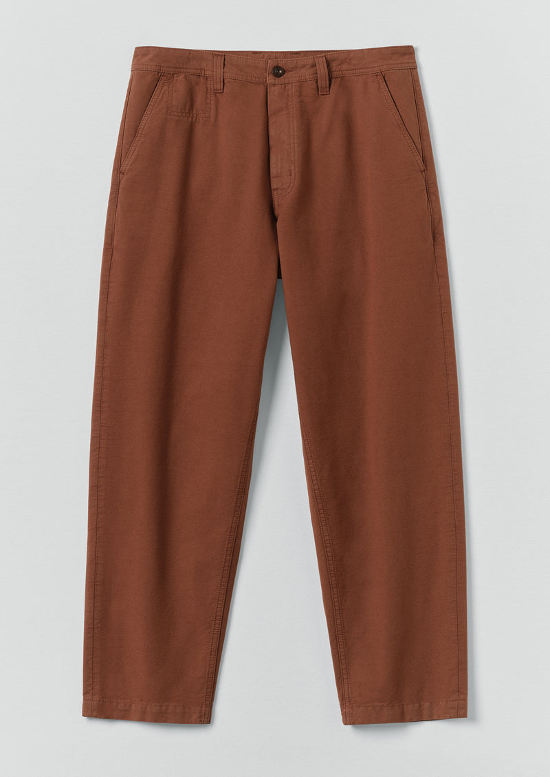 Cotton canvas. Garment-dyed. Relaxed fit. Tapered leg. Slant side pockets. Belt loops. Corozo button and zip.