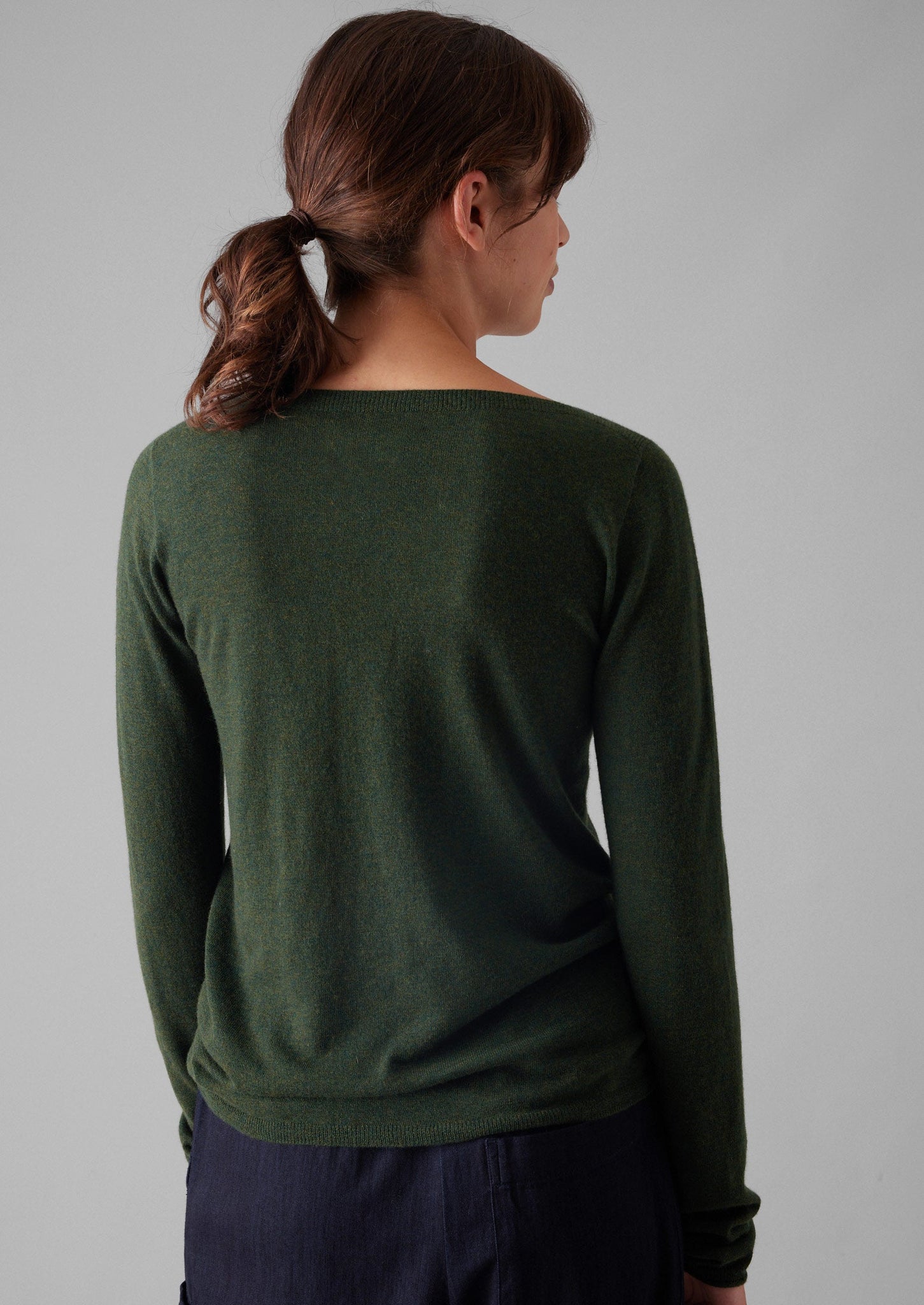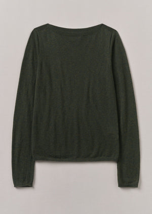 Soft sweater knitted from a fine worsted wool and cashmere blend, with a ribbed boat neck and saddle shoulders. A single jersey roll at the cuff contrasts with deep ribbing at the hem.