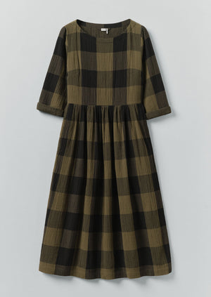 Our macro gingham dress is made from double-faced crinkle cotton. With a light texture, gathers below the waist create fluid movement. Three-quarter-length sleeves can be folded shorter or worn as they are.