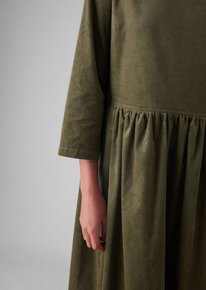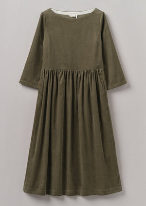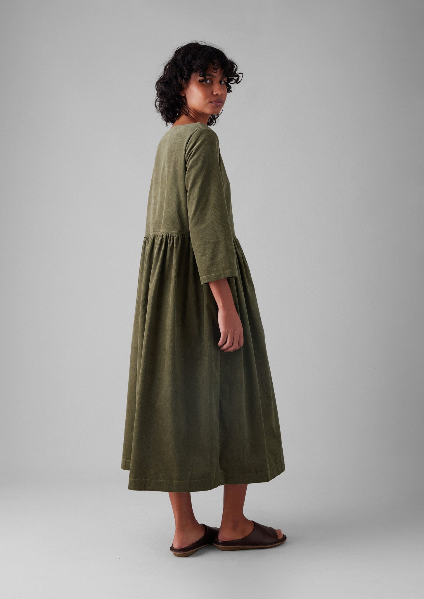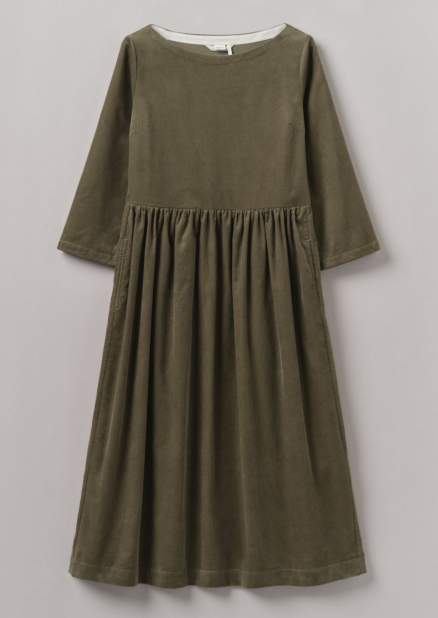 Our long dress is made from organic cotton cord with a soft, supple handle. With gathers below the waist and three-quarter-length sleeves which can be folded shorter or worn as they are.