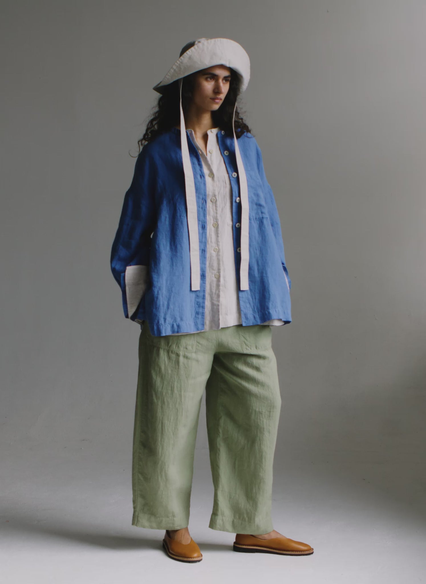 Slubbed linen. Garment-dyed. Easy shape. Elasticated waist. Side pockets. Back patch pocket. Cropped barrel legs.