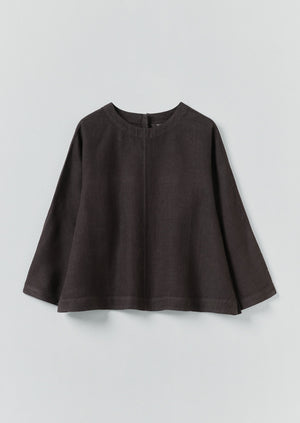 Garment-dyed linen. Easy fit. Round neckline. Wrist bone-length sleeves. Central lapped seam. Top stitching. Buttoned back neck opening. Corozo button.