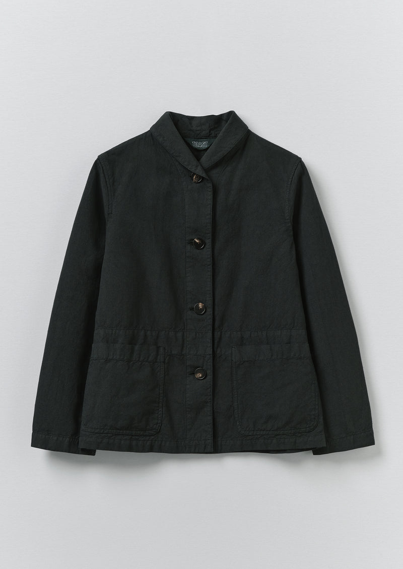 Our Hal workwear jacket is made from an organic cotton and linen-blend woven into a micro houndstooth. Cut to a straight shape with a curved collar, then finished with patch pockets and garment-dyed.
