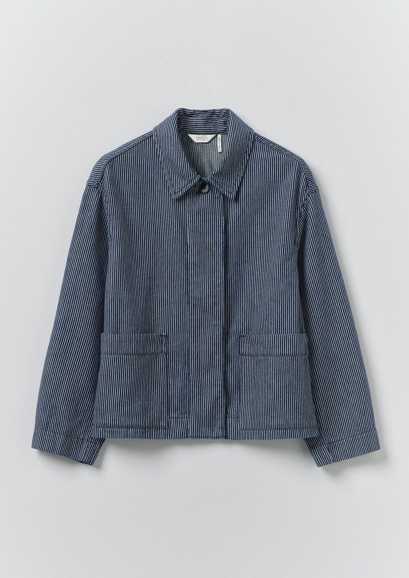 A wide placket balances the boxy silhouette of our striped denim jacket. Punctuated by front patch pockets and accented by corozo buttons.