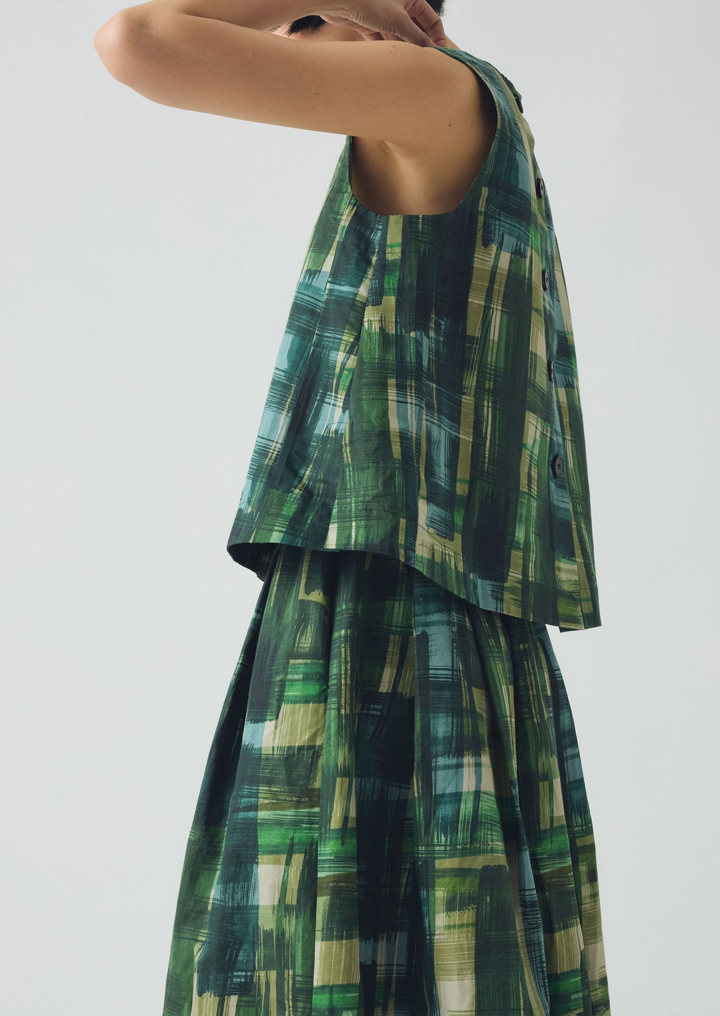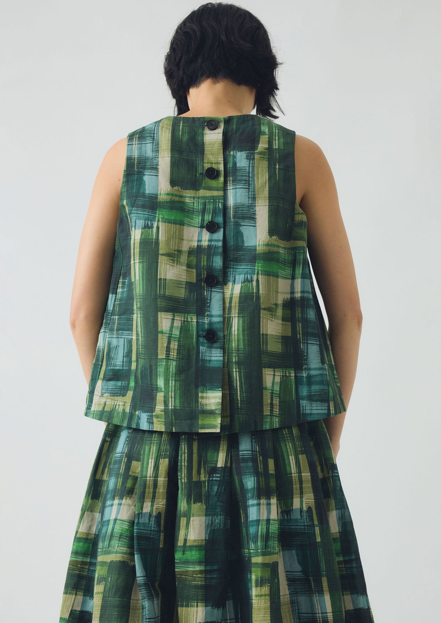 Swingy sleeveless top made from a linen and organic cotton blend. With a print inspired by a painterly interpretation of tweed, created with large, abstract brushstrokes. Side splits and horn buttons at the back. Stitched facings at the neckline, arms and hemline.