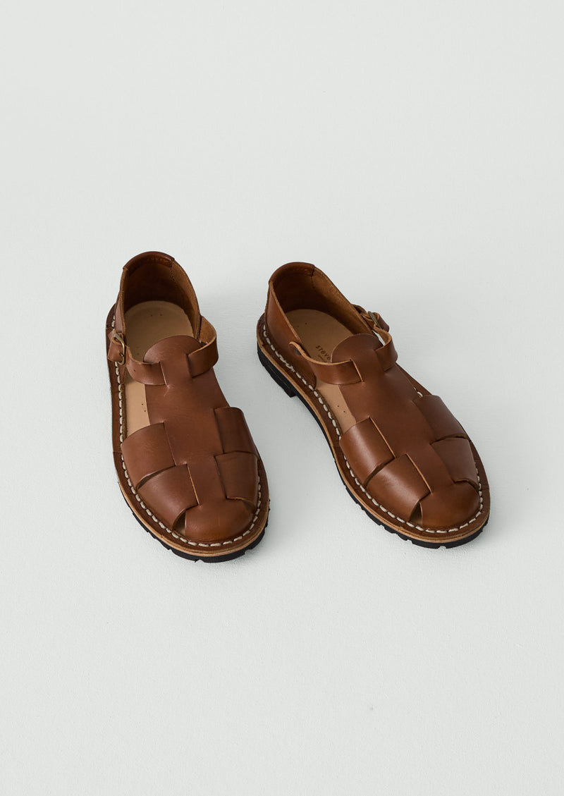 Considered Maypole sandals made in Spain by Steve Mono, echoing classic fisherman styles. Made from vegetable-tanned leather with interwoven straps and set on a practical rubber sole. Exclusive to TOAST. Pin marks in the inner sole are characteristic of the traditional shoemaking process.