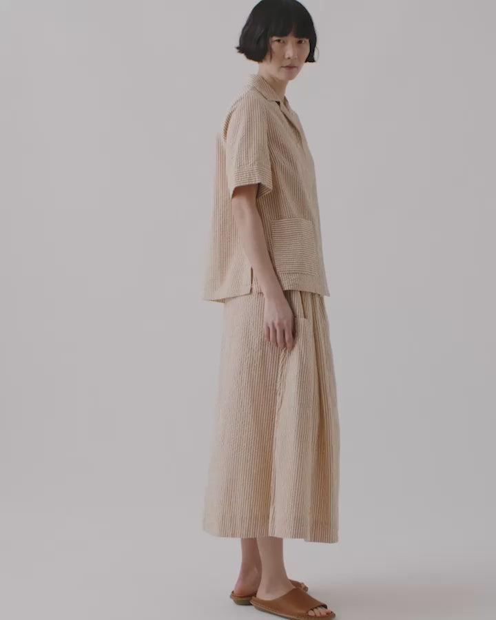 Our effortless stripe skirt is made from a cotton seersucker, shaped by gentle pleats descending from the waistband. Falling to the lower calf with an elasticated waistband for comfort. Finished with side pockets and patch pockets at the hip.