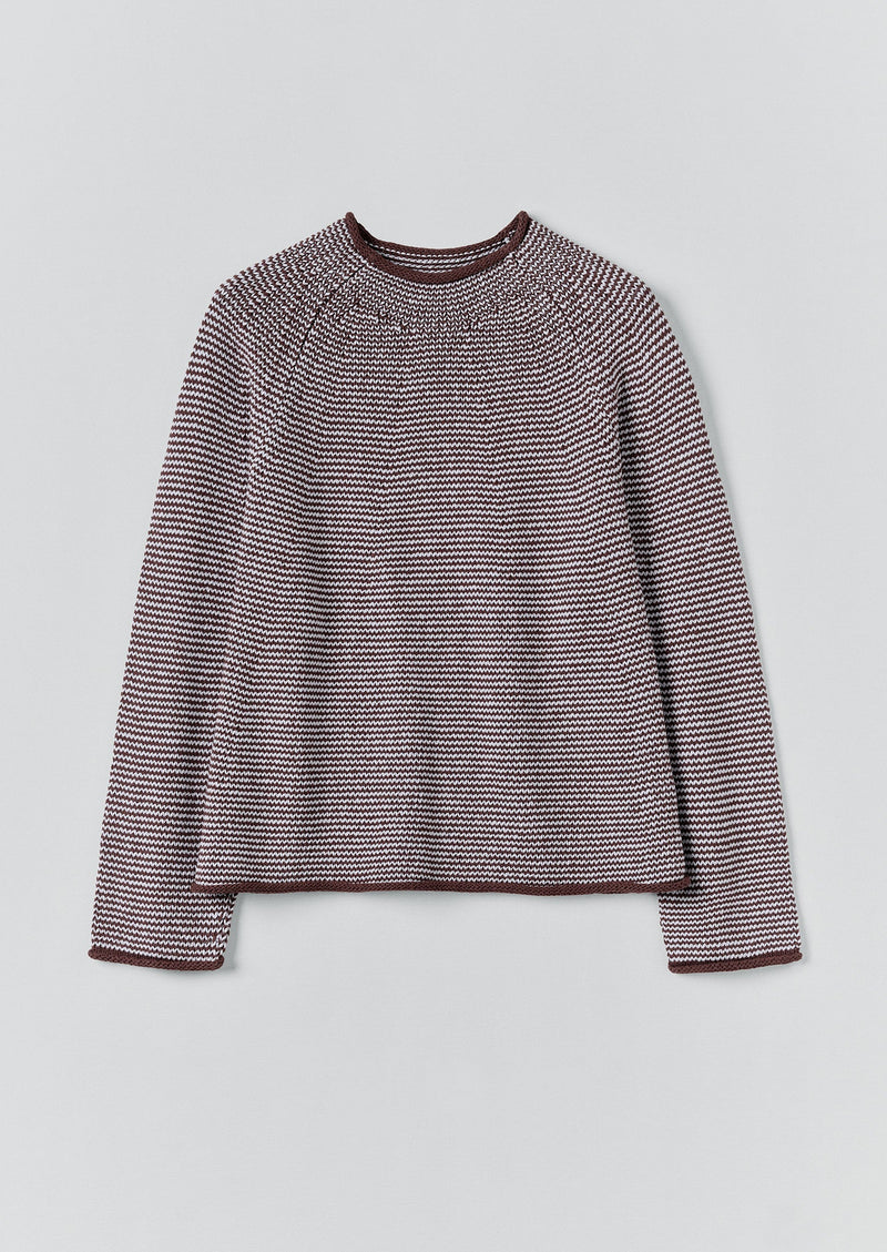 Our swingy striped sweater has shaping at the yoke for a considered silhouette. Made from a textured linen and cotton blend to a high-neck silhouette with raglan sleeves, then finished with rolled edges.